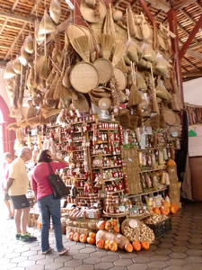 天井まで届くほどの高いところまで、自然素材のざるやほうきなど家庭用品がいっぱい!! 床には木製の小さな乳鉢が並んでいて、その完成度の荒々しさがいかにも手作りといった風情で、楽しくなってしまいました。