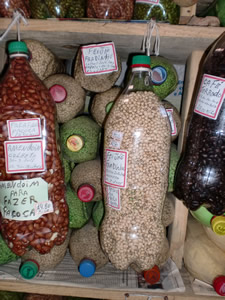 おもしろいなぁと思ったのは、豆類・穀類の販売の仕方。こんなふうにペットボトルに詰めてありました。