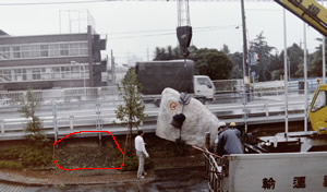 クレーン車で今まさに石を置こうとしているその位置は、