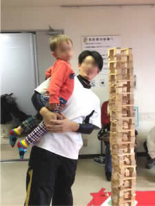 積み上げて、まずは高さ比べ。なんと、70段以上のブロック組で、椅子の上に乗っかりながら頑張っていました。ボランティアでお手伝いに来た専修大学付属高校の学生たちも、「ハウルの城」並みの大作に挑戦して対抗。以降の来場者の目を引くことになります。