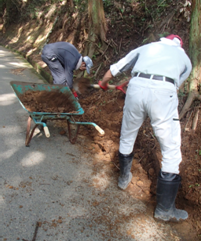 また違う日には、桑鶴地区の区長から側溝の泥だしの依頼があり、草刈りボランティアの作業安全性を考慮しながら桑鶴地区の区長と、以前農ボラを一緒に行った福岡からのボランティアと私の3人で作業を行いました。泥の中には杉の枝なども入っており、また場所によってはたくさん泥が溜まっていて、当初半日位の作業と考えていましたが、思った以上に作業時間がかかりました。しかし、無事作業を終えることができ安心しました。