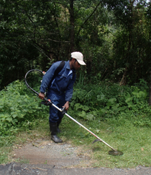 また、もちろん西日本研修センターの男性チームも活躍してくれました。今回は、大切畑・桑鶴地区の草刈り作業を行う予定でしたが、この地区は、布田地区同様、家屋の被害が大きく、大切畑地区の高台にある道路は土砂崩れの恐れがあるため、今回は草刈りを見送りました。実際に草刈りを行ったのは、風当地区~桑鶴間地区の長い道路沿いで、車に注意しながらの作業となりました。約2.5kmと長い距離の作業でしたが、無事に終えることができました。猛暑のなか本当にお疲れ様でした。