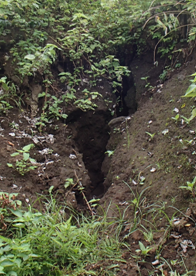 右の写真のように、草が覆われているとこのような地割れに気づかずに足がはまり大けがに繋がる可能性があります。