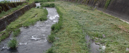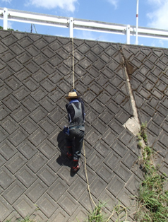 今回は、1週間前に西日本研修センターの職員と研修生が行った木山川堤防内の残りの作業を行いました。今回草刈りを行う場所は、堤防内側に降りる階段を使用すると、川を横切らなければならないため、濡れることを想定していましたが、ボランティアさんが堤防の上のガードレールにロープを結んで固定してくださったお蔭で堤防内側へ入ることができ、草刈り機もおろすことが出来ました。お蔭で濡れることなく無事作業を行うことができました。