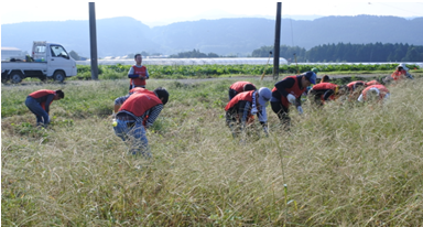 今回は、宮城県名取市の海岸林再生プロジェクトでもお世話になっている三菱UFJニコス(株)の九州営業部から農業ボランティアに参加して頂きました。作業内容は、からいも(サツマイモ)農家での除草作業でしたが、適期に草取りが行えなかったこともあり、さつまいもの葉が草に覆われていました。ボランティア参加者にとっては、大変な作業で、暑さにも堪えていたようでしたが、一生懸命作業してくださいました。海岸林再生プロジェクト同様、西原村でもボランティア派遣の協力をして頂きありがとうございました。