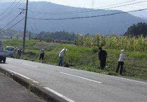 今回、大峯地区の方々と共に草刈り作業を行いました。地区住民の方の参加者が多く、作業は効率良く行われたため、約2時間で終了しました。また大峯地区長の好意でお昼はキャンプ場で昼食会に参加させていただきました。その際に、地区の被災者の方から、家の壁や床を修理しながら生活している話を聞き、まだ被災者の方が落ち着いて生活ができていない事を改めて知りました。被災者の方々が1日もはやく落ちついた生活ができるようことを願いたいと思います。