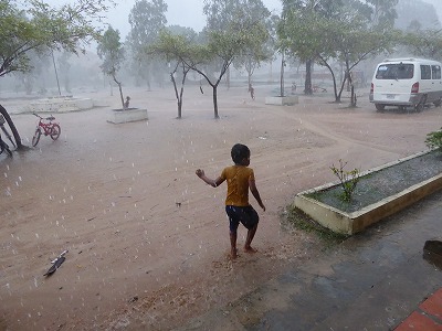 ⇧ゲリラ豪雨に軒下で雨宿りをする牛。        ⇧ゲリラ豪雨に外で踊り出す子ども。