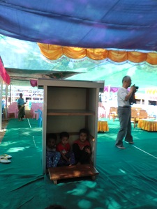 写真は記念式典の準備をしている最中にステージに置かれた演台の裏柄に入り込んで遊んでいる子どもたち。お父さん・お母さんと顔がそっくりなので、初めて会ったのに「あ、この子は●●さんのお嬢さんだ!」とすぐに分かりました。なかなかなついてくれなかったのが残念でしたが……。