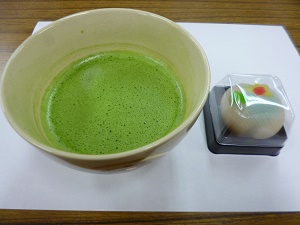 和菓子の練り切りつきです。お抹茶の苦みと練り切りの甘さがちょうどよくいつも美味しくいただいています。