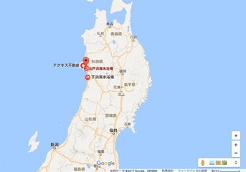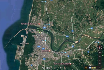 ↑この辺です。Google earth(写真右)で覗くと確かに緑色の海岸林が見えます。