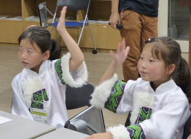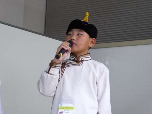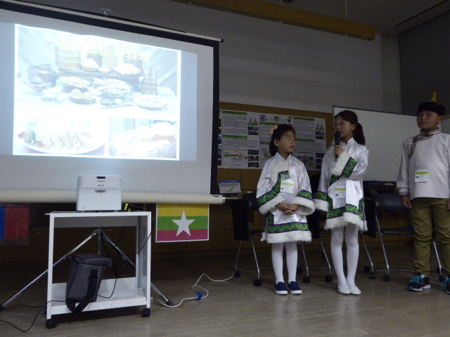 今回は「子供の森」計画の親善大使としてミャンマーとモンゴルからかわいい子どもたちがやってきました!そこでミャンマーとモンゴルの子どもたちに自分たちの国で起こっている環境問題、取り組んでいる活動について発表してくれました。ミャンマーからは干ばつ、水問題などについて、モンゴルからは洪水、たばこのポイ捨てによる火災、砂漠化などが起こっていることを教えてくれました。またモンゴルでは学校の周りに木が少なく、砂塵が吹き荒れているため、子どもたちのほとんどは学校の屋内で遊んでいるそうです。