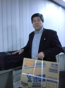写真は荷物の準備をしているところですが、事務局長が抱えているラーメンは、本人が現地で食べるためのものではありません。 フィリピンで活動するスタッフのための慰問品なのです。 毎年オイスカ築地推進協議会から海外のスタッフにと食料品が届けられます。後ろに見えるカバンにも入っています。 築地推進協議会ならではの活動です。
