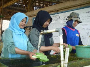 収穫した野菜をきれいに洗う女性研修生たち。