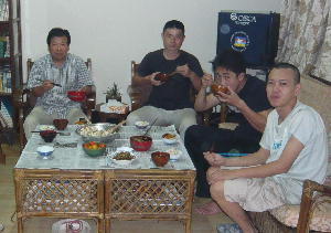 写真は、作って頂いたご飯を前にご機嫌な駐在員。 たまたま居合わせたボランティア大野君。 メニューは、ちらし寿司、煮物、などなど。 とっても美味しかったのでしょう。 カメラを向けられてもお椀にかじりついている人もいますね。