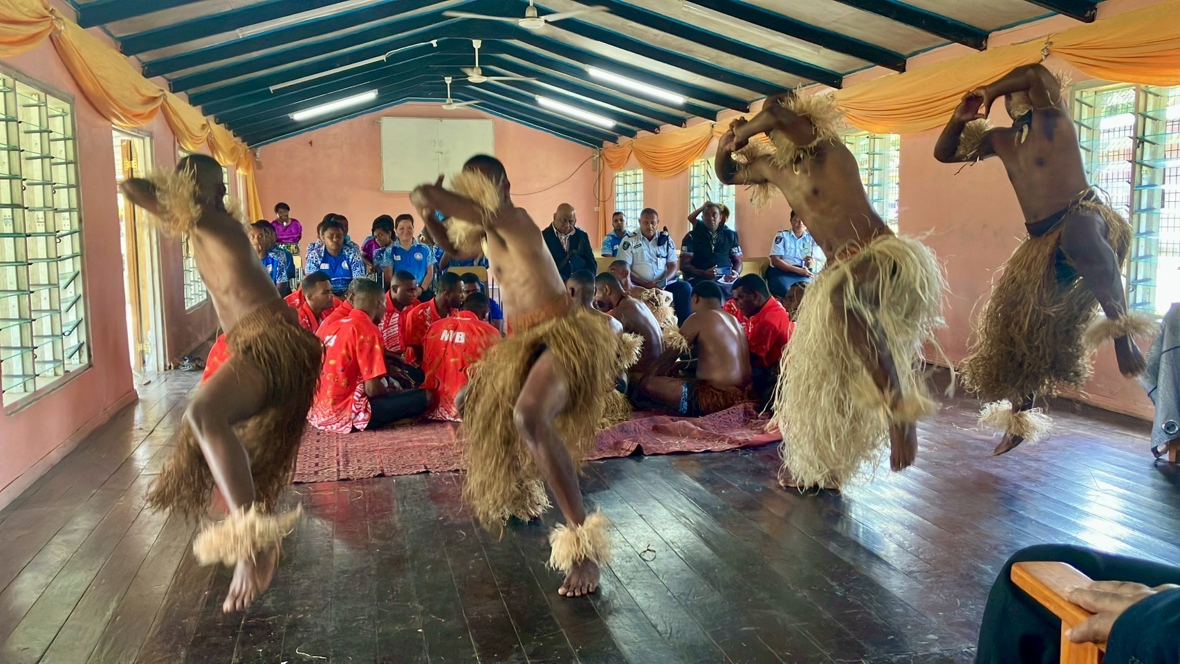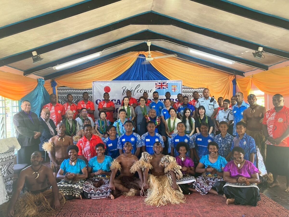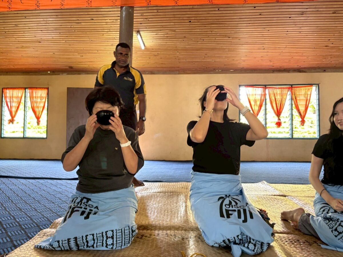 定刻どおりフィジー到着。到着後の荷物検査で食料品(お土産)を大量に持ち込んだ事務局(自分)のバックのみ開けられてチェックを受けましたが、皆さん無事フィジーに入国。ホテルでしばしの休憩後、オイスカがフィジーで連携している青年スポーツ省と協働運営しているナサウ研修センターへ。今年も、青年スポーツ省の大臣に歓迎していただき、ナショナルユースバンドによる伝統的なセブセブの儀式やメケと呼ばれる歌と踊りを披露していただきました!