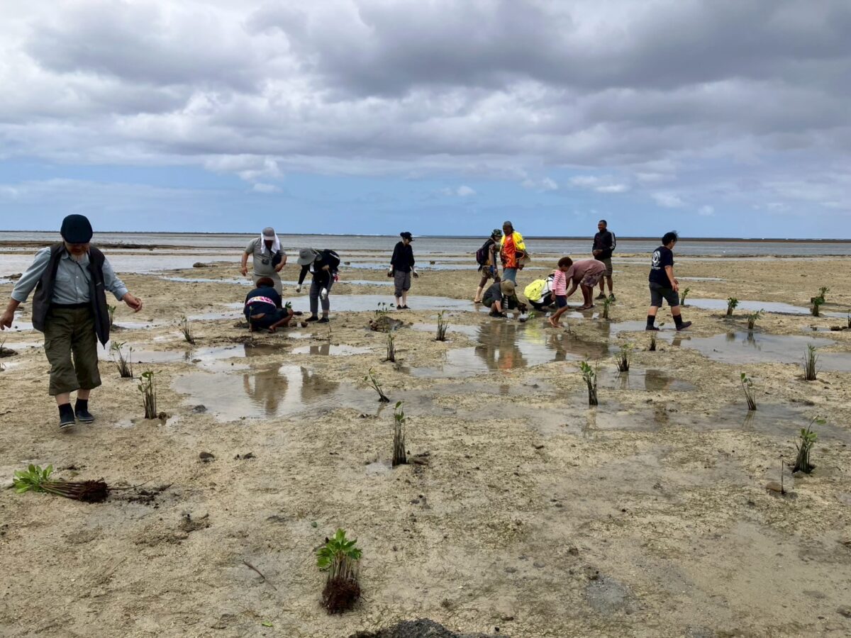 フィジー2日目は早速マングローブ植林と「子供の森」計画参加校での植林&交流です。マングローブ植林は昨年も植林を行ったタガゲ村です。実は、昨年みんなで植林した苗木500本は、サイクロンなどの影響で数本を残し流されてしまったとのこと。そこで、今年は植え方を変え、苗木数本を束にして植えるという手法で再トライ!場所が違えば、環境条件も違うということで、事前に試験的にこの手法を試していただいていましたが、2度の波浪・高波にも耐えたとのこと。今回はしっかり根付いてくれるように、一つ一つ丁寧に植えました。また、一部泥と砂が入り混じった場所には、1本1本間隔をあまり広く取らず植える植え方でも植えてみるなど、場所や地形、土壌条件などによって様々条件の異なる中で、活着させて育てるということの難しさも改めて感じました。