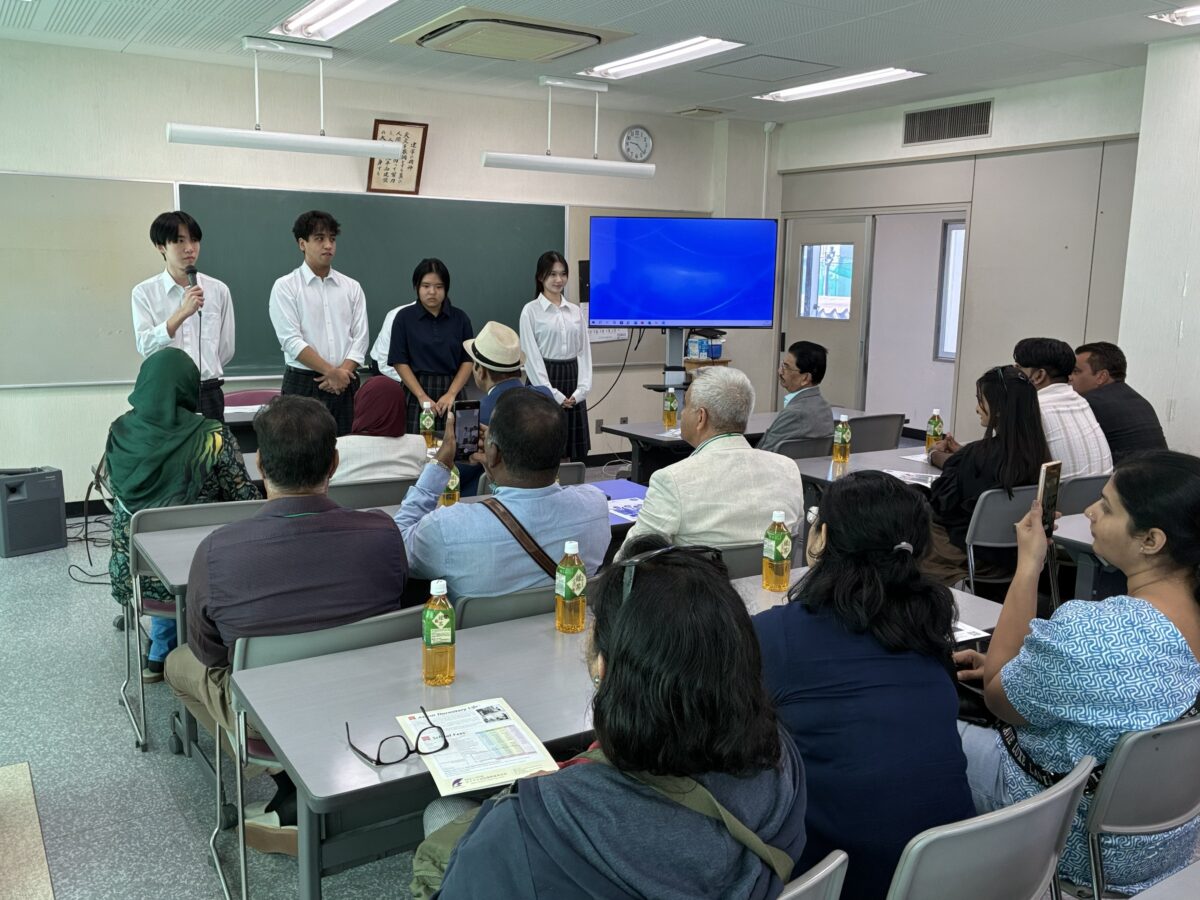 静岡県浜松市西部の浜名湖畔に位置するオイスカ高校では、約40名の留学生が学んでいます。ベトナム、タイ、フィリピンなど出身国の代表が約1時間にわたり、来校者を歓迎する挨拶を行い、学校生活の様子や経験、インドの学生交流の報告などを行いました。