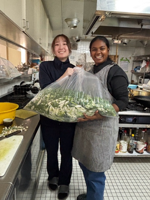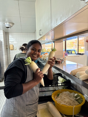 お昼ご飯を挟んで、午後も引き続き野菜の仕込み。インドからの研修生アイシャさんと一緒にちゃんこ鍋用のねぎや大根の仕込みを担当しました。量が多くなかなか大変な作業でしたが、研修生の皆さんといろいろなお話ししながらだったので、楽しくあっという間に感じました…!