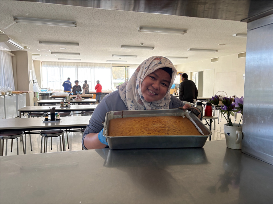 作業の合間には、スリランカからの研修生タリニさんがみかんを渡してくれたり、お菓子作りチームの研修生がかぼちゃケーキの端を持ってきてくれたりと、研修生みんなのさりげない優しさにとても心が温まりました…!