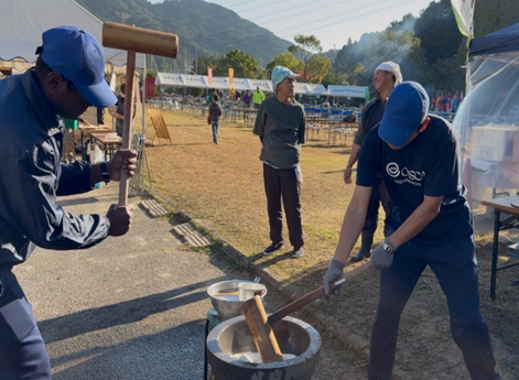 研修生の方と一緒に私も餅つきのお手伝いをしましたが、実際にやってみると、思っていた以上にリズムよくつくのが難しく、力加減にも苦戦…。一回のお餅をつき終わるだけでもヘトヘトになり、自分の体力のなさを実感しました…笑