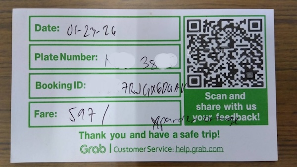 空港を出るとすぐにGrabの予約ブースがあり、そこで行き先を告げると近くにいるドライバーを手配してくれ、タブレットに電話番号と名前を入力すればOK。料金と車のナンバーが書かれた紙を渡され「だいたい3分で来るからそこで待ってて」という流れ。