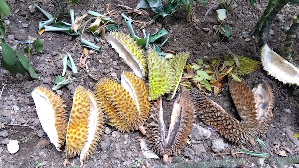 数日前、彼女のいとこがミンダナオから車で大量に運んできて、毎日食べ放題状態でドリアンが食卓に出されるのだそう。確かに、庭にはドリアンの殻がたくさん並んでいました……。