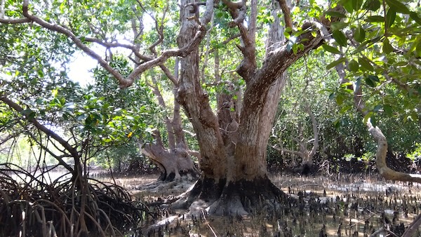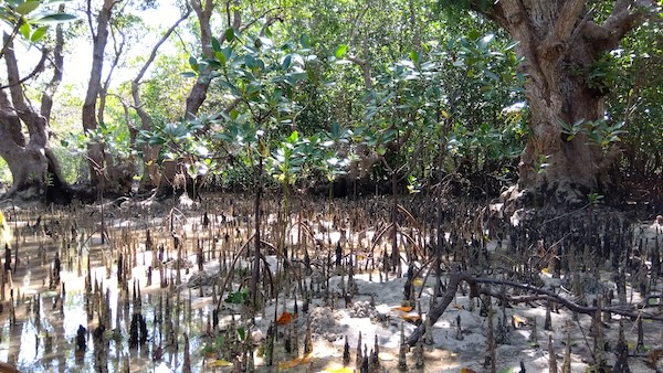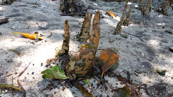 植林した木とは別にもともとここに生えていたと思われる大きな木の根元にたくさんの筍根が出ていました。マングローブの根はタコの足のようになる支柱根がよく認識されていますが、そのほかにも板のようになっている板根、膝が曲がっているようになっている膝根、そして、文字通り筍が生えるようにニョキニョキ地面から出ているのが筍根(じゅんこん)です。あらためてよく見ると本当に筍みたい!