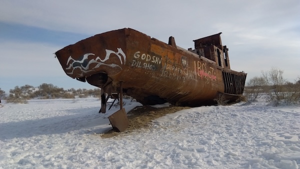 かつては世界で4番目に大きかった湖、アラル海が干上がってしまったことで広がっているアラル海沙漠への植林です。沙漠の入り口にあたるムイナクは、かつては漁村としてにぎわい、水産加工に従事する人たちもたくさんいた町です。