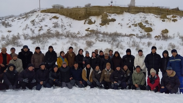 今回一緒に活動してくれたのは朝早くヌクスを出発してきてくれたカラカルパクスタン農業大学とカラカルパクスタン州立大学の学生たち。アラル海に来るのは初めてという学生も多く、雪景色も手伝ってみんな大はしゃぎでした。