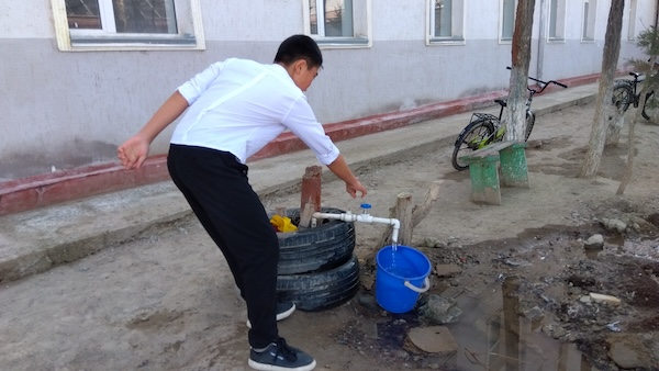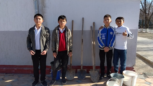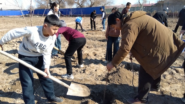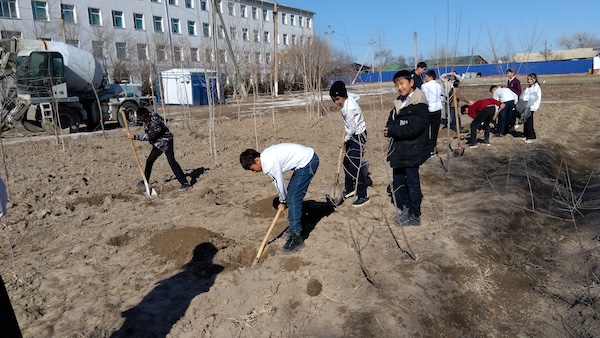 アラル海の沙漠での植林の後は、「子供の森」計画参加校での植林の様子をご報告。