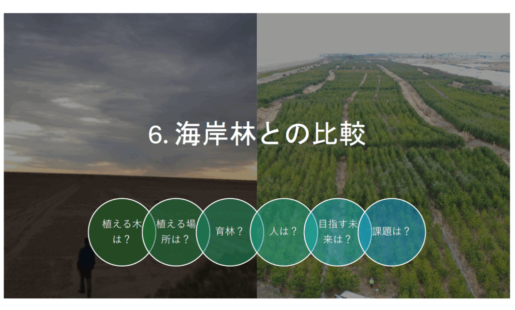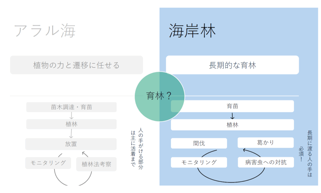 今回少し焦点を当てたかったのが、アラル海の現場と名取海岸林の現場の比較です。