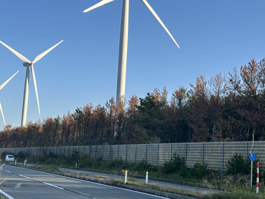 この写真は、三浦さんが9月末?に撮影した秋田市・秋田港の北「夕日の松原」です。今年の東北全体は、大変深刻な松クイ被害になってしまいました。