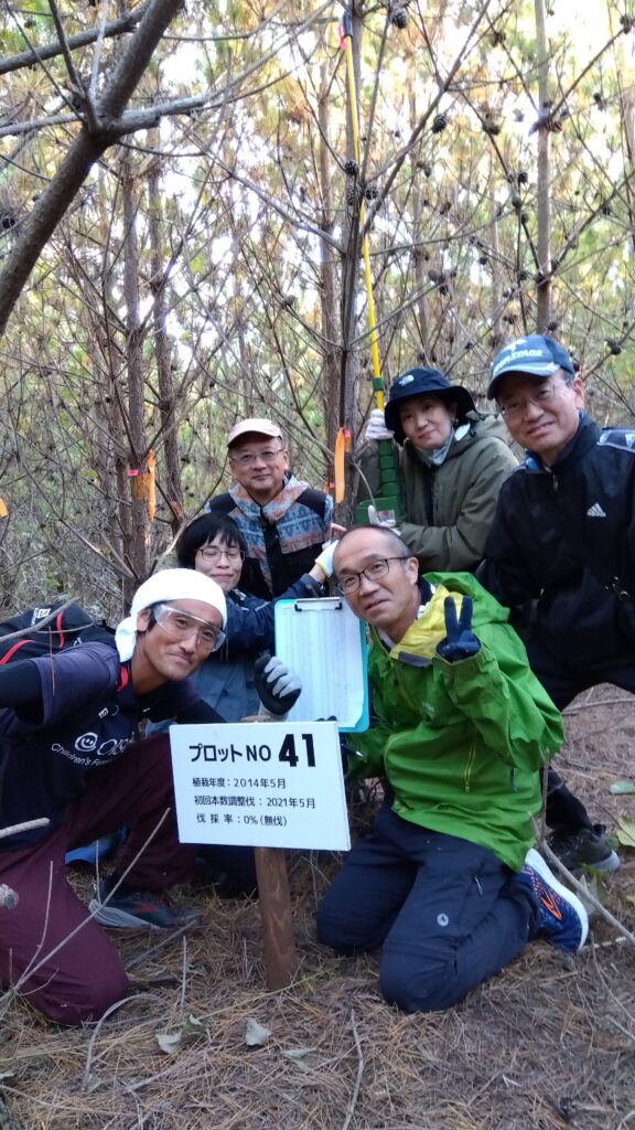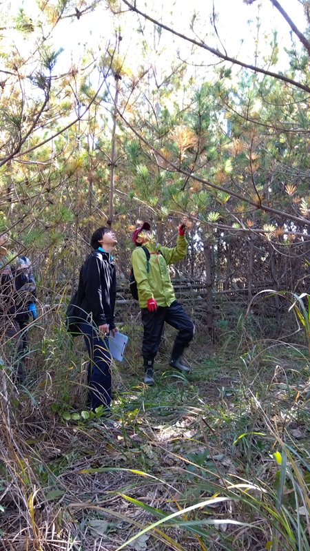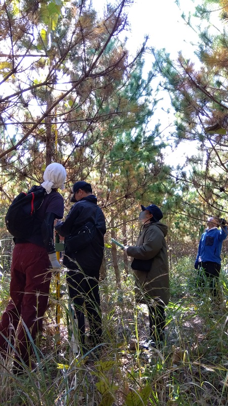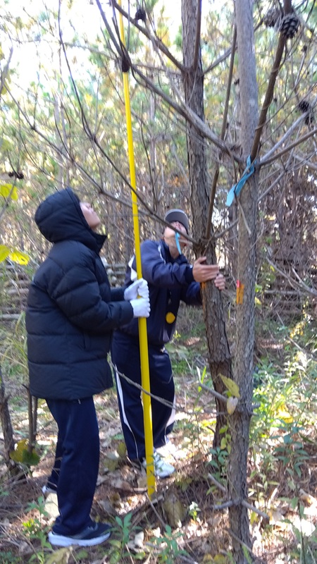 ①の樹高係は、測竿と呼ばれる樹高を図る道具を使います。この道具は竿を伸ばしていくと、手元に先端の高さが表示されるものなのですが、5mにも7mにも成長しているマツのテッペンは、下からは見えません。そこで少し離れた場所にいる④サポート係が、「あと30センチぐらい上」「行き過ぎ!きも~ち下げて!」などと指示を出して、竿の上げ下げを調整していきます。