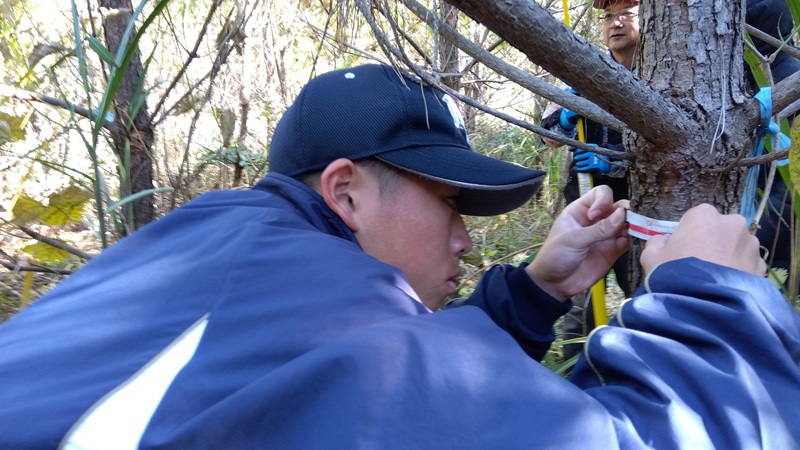 ②の胸高直径係は、地上から約1.3mの高さの幹の直径を測定します。巻き尺は、通常の目盛りがついている面と直径が図れる面とがある特別なものを使用。