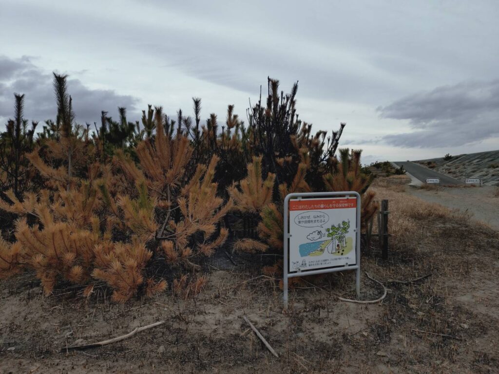 吉田です。残念ながら、1月28日(水)午前10時45分ごろ、名取市海岸林最南部の防潮堤沿い「北釜ゲート」付近の県有海岸林で、100㎡・クロマツ20本あまりを失う火事があったと、名取事務所佐々木統括から報告がありました。「消防車3台が出動。原因は閖上消防支所で調査中であるが、現地の状況からタバコ火からと推察」「県と相談し、補植も検討する」とのことでした。