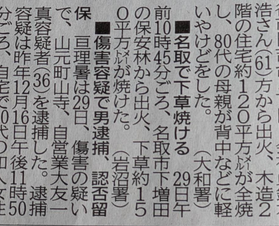 名取海岸林の植栽後10年で不審火は2度目です。前は植えたばかりの内陸防風林の横でゴミを燃やし、それが延焼して、記憶では270本を失い、空港のフェンスも焦がしていました。森林法、消防法、航空法違反…と思っていましたが、よく考えれば、刑法116条違反、つまり刑事罰ですよね。今回は地元ボランティアリピーターの方たちにだけ、山火事情報を伝えたところ、早速見に行って写真を送ってくれたり、新聞報道を確認してくれたり。私は今月27日午後まで動けないので、助かりました。その一人から「未必の故意」との言葉がLINEのなかにありました。私は知らない言葉だったのでアレコレ調べると、火の不始末やたばこのポイ捨てによる「過失」で火事を発生させた名取での2つの火事は、まさにこの言葉の通りの「失火罪」。確定的故意でなくても故意犯として処罰される対象にあたるということです。