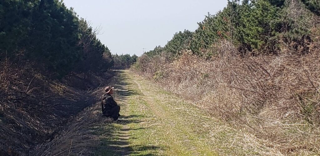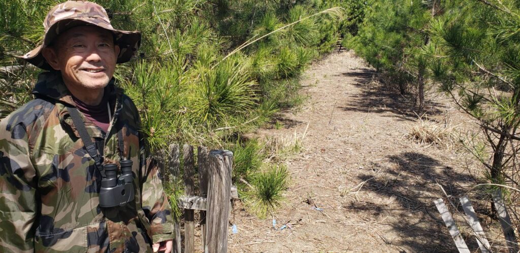 三浦さんは、見通しの良い場所で、こうやってジーっと耳を澄ましながら鳥見します。
