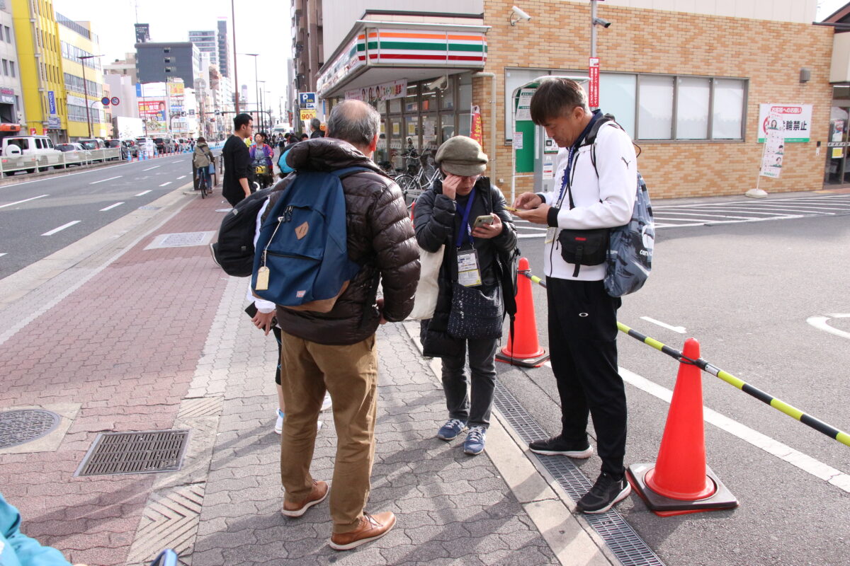 地下鉄千日前線「今里」駅前のセブンイレブン。ここもいつもの応援ポイント。中盤までの持ち場で役目を終えた応援団の大半が、移動して集結。千葉から加勢に来てくれた住友化学の山本さんは、朝からずっとここに陣取ってくれました。最後の力を振り絞るランナーを応援する声は、目の前に高いマンションがあるため、めっぽう響き渡ります。