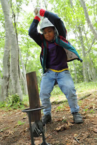 北海道へ移動した一行は、9日、えこりん村(恵庭市)において、グリーンウェイブ活動に参加。はじめに、持続可能な森づくりについての理解を深めるため、北海道における森林の現状と生物多様性を支える森の役割についてレクチャーを受けました。その後、道森林ボランティア協会の指導を受けながら、えこりん村敷地内5haの森の中で、間伐された木の運び出しや薪割りなどの作業を行いました。気温が低く、肌寒い日でしたが、楽しみにしていた野外活動とあって、道内から集まった高校生や大学生ら約50名と交流を深めながら楽しく過ごす様子が見られました。
