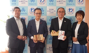 サミット(株)中村聖広報室マネージャー(左から2番目)から濱野区長(右から2番目)に目録が手渡された。寄贈されたおもちゃの中には、東京都の水源となっている山梨県丹波山村や品川区とふるさと協定を結ぶ早川町の材で作られたものも含まれている