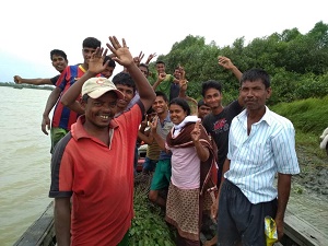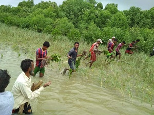 そうした状況下でも、現地スタッフの手で活動はとどまることなく進められており、去る7月21・22日には約3haに1万1千本の苗が植えられました。プロジェクトではこれまでに895haに764万本が植えられ、マングローブ林が成長した集落では、サイクロンによる被害が軽減されるなどの成果が確認されています。2日間の活動に参加したのは、カワルディア村の住民ら約25名。周辺地域の過去の取り組みから、植林の意義を十分に理解した住民らが積極的に取り組む姿が見られました。