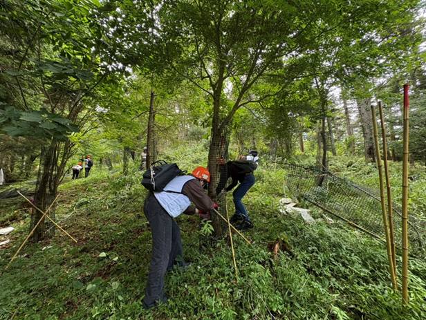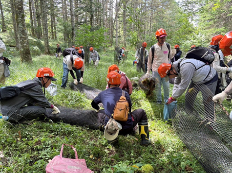 少し斜面のきつい現場ではありましたが、参加者の皆さんは時間どおりに作業を完了してくださいました。作業後は、使用しなくなったシカ害対策ネットの回収や、道までの運搬作業にも協力いただきました!