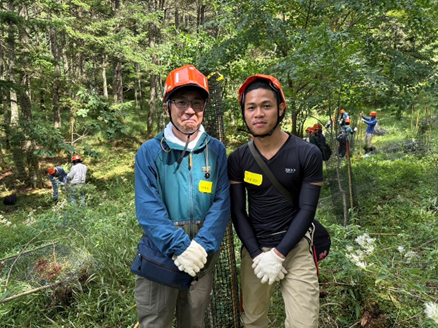 作業が進む中、参加者に話を伺うと、「新入社員です。山が好きで、自分から参加しました!」と語るその表情には、意欲が満ちていました。今回が初めての参加ということもあり「これは何の木ですか?」「倒れた木も起こしてあげると、また生き返りますか?」と、自然や作業に関する質問が次々に飛び出し、積極的に学ぼうとされる様子が印象的でした。
