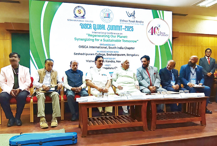 25年11月20・21日、インドのカルナータカ州ベンガルールで、オイスカ南インド主催の「グローバルサミット2025」を開催。日本、スリランカ、ネパール、メキシコからもオイスカ関係者が出席する中、「地球再生―持続可能な未来に向けたシナジー」をテーマとした発表が行われ、カルナータカ州のH・K・パティル法務大臣をはじめ、共催のシュシャドリプラム大学、インドの青年育成団体である世界青年センター(VYK)の代表者などが、地球環境の危機に対する現状打開に向けて提言しました。