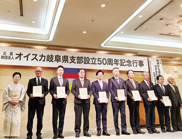 25年11月9日、岐阜市内で、岐阜県支部50周年式典が開催され、会員や支援者など約100名が出席し、半世紀にわたる活動を振り返るとともに、設立時から取り組みを支えてきた9名(法人7社、個人2名)に会員継続50年の特別功労賞が贈られました。