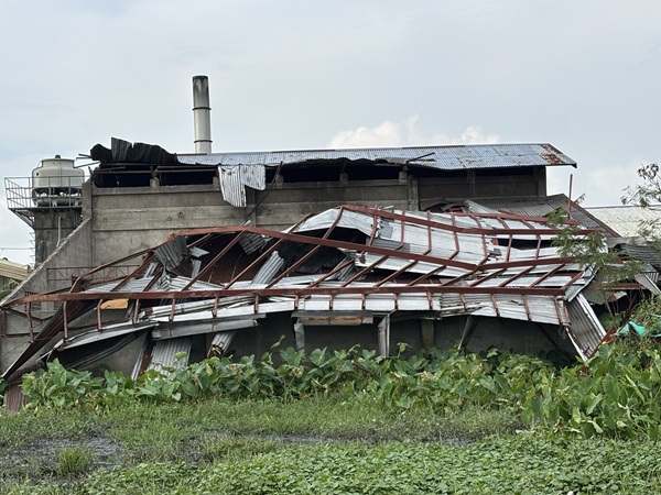 特にセンターの活動の中心である養蚕普及のために重要な施設である製糸場のボイラー棟の屋根はご覧の通りズタズタです(下写真左)。特に燃料量のもみ殻を貯蔵している建物の部分がひどく損壊しています。また壮蚕所も倒木により完全に倒壊したままです。
