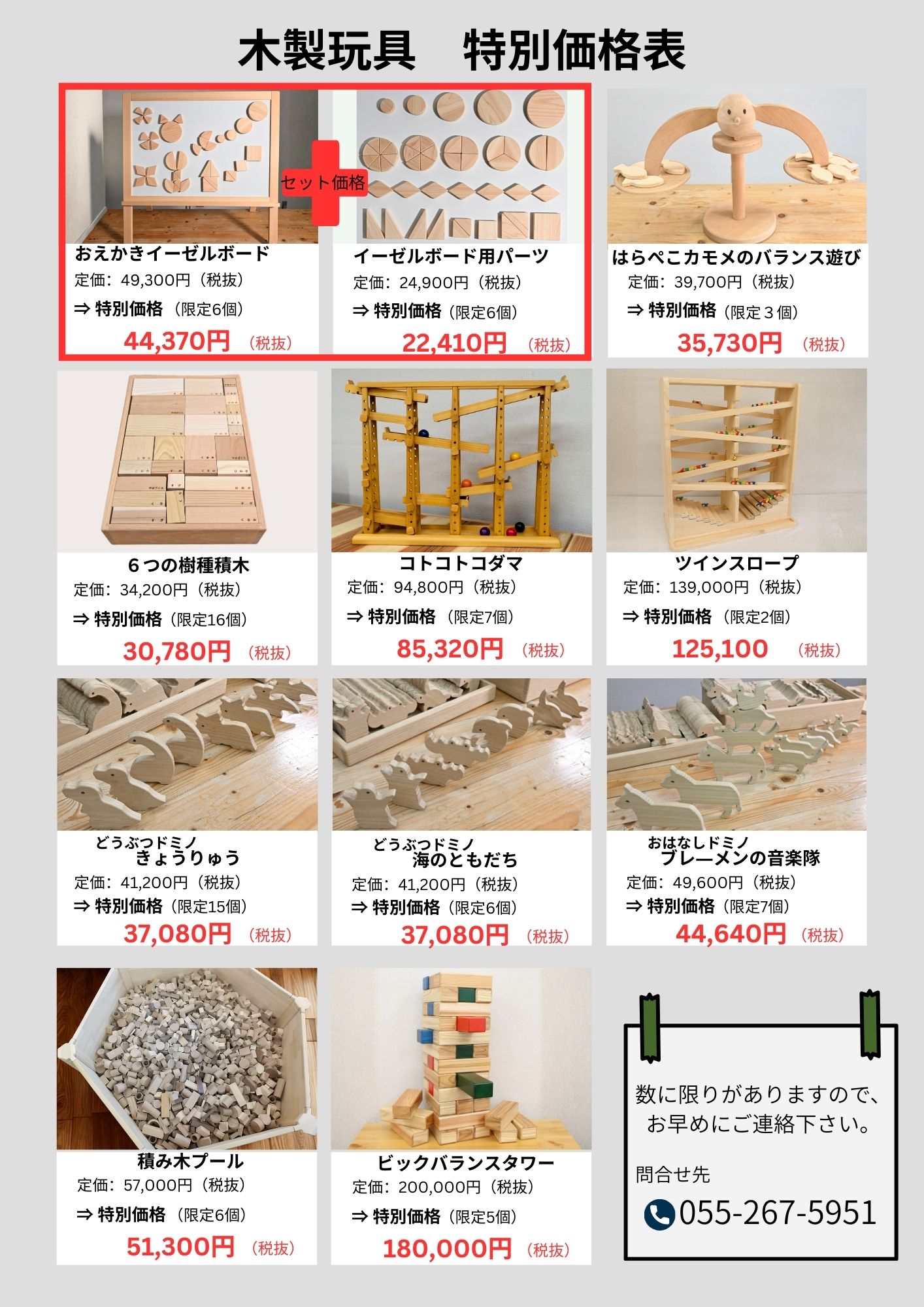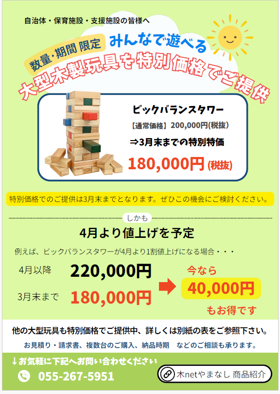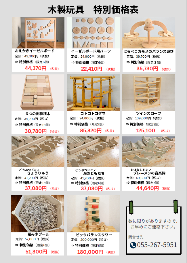 普段、私たちが木育ひろばで使用している大型の木製玩具を現在、特別価格にて販売しています。