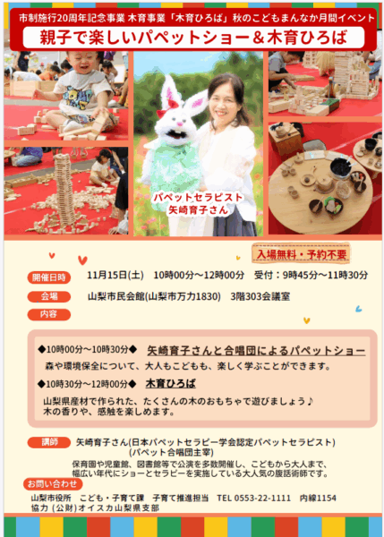【お知らせ】<11/15(土)・山梨市> 市制施行20周年記念事業 木育事業「木育ひろば」 を開催します